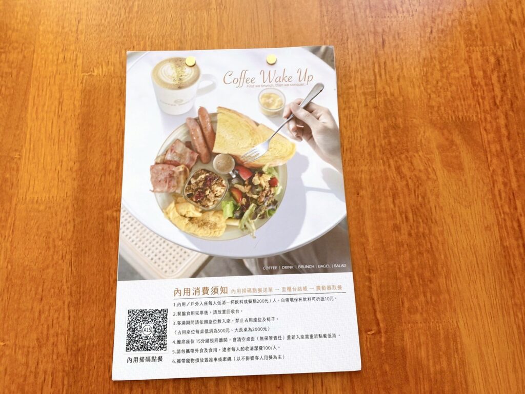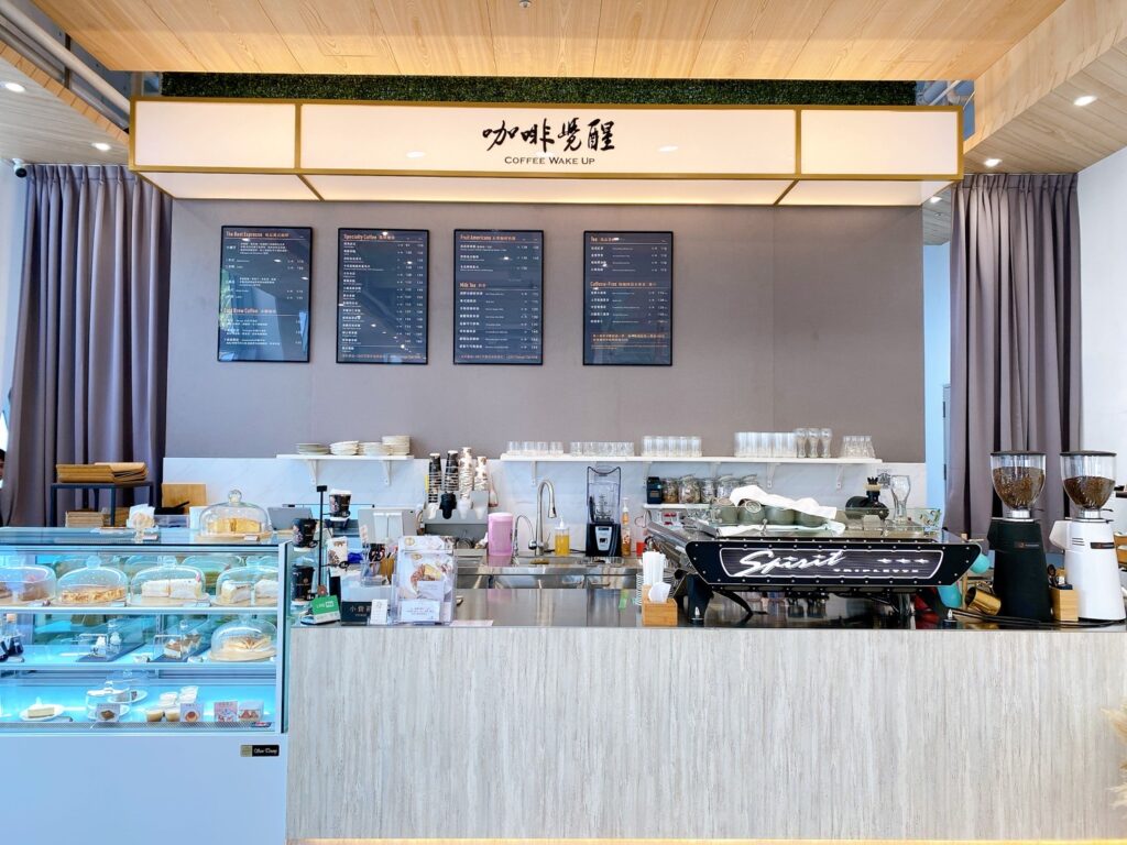走進店裡,第一眼就會被寬敞又帶設計感的吧台吸引。櫃檯用淺色石紋搭配大面積的淺木天花板,整個色調柔和又溫暖,簡單卻很有質感。吧台正上方掛著一個微微透光的白色招牌,上面用優雅的字體寫著「咖啡覺醒」,像是整個空間的核心。吧台後方的灰色背牆上整齊掛著四面黑底白字的菜單,義式咖啡、手沖、果味美式到各種茶飲一應俱全,讓人一進門就感受到這裡對咖啡與飲品的用心。