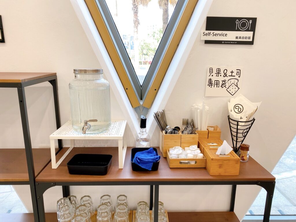 店內採用線上掃碼點餐的方式,點好餐後再到櫃檯結帳,並領取震動器等待取餐。用餐完畢後需要自行將餐盤回收。旁邊也設有自助區,提供白開水、餐具與衛生紙,奶油球、砂糖等也都可以自行取用。