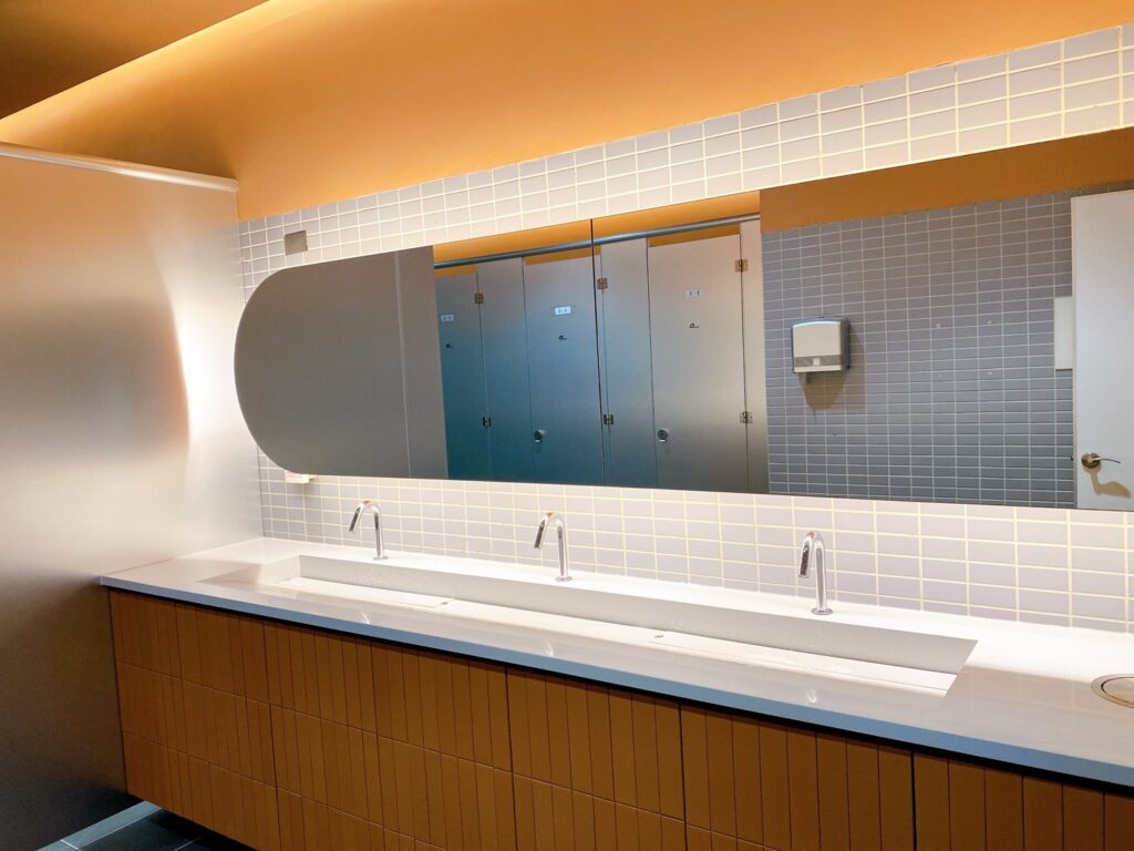 洗手台明亮乾淨,備有洗手乳和烘手機,而且廁所有好幾間,女生也不用擔心要排隊太久。