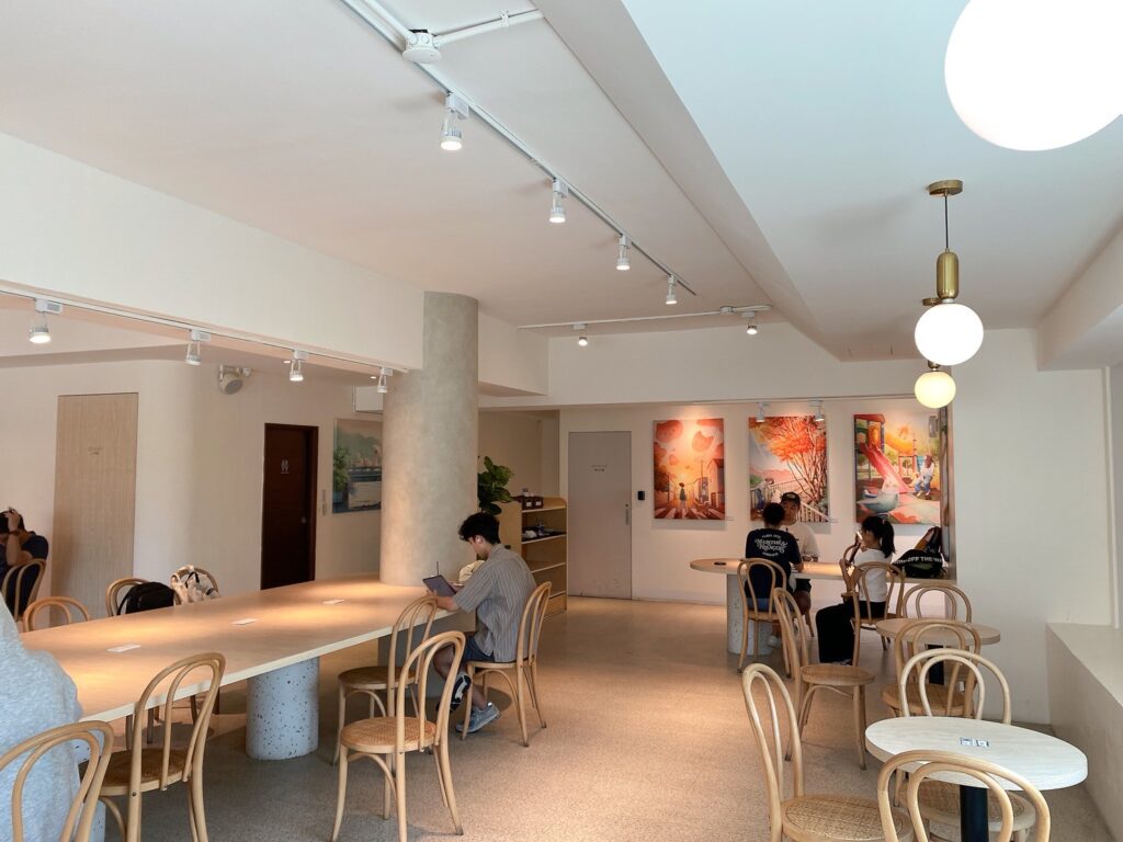 沿著樓梯走上 2 樓,空間比想像中寬敞,採光也很好。這裡的氛圍比 1 樓更安靜,適合需要長時間專注的人。牆面上掛著幾幅插畫,讓整體空間多了幾分溫度。