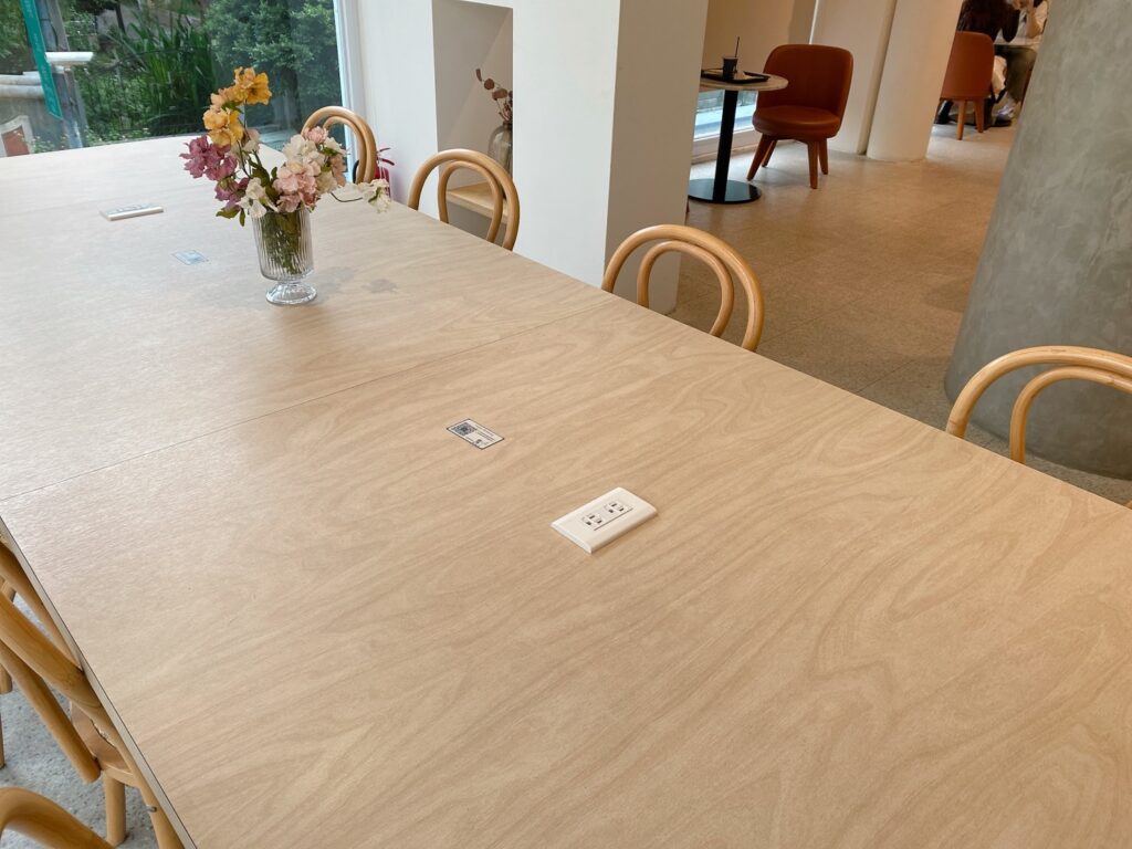插座不是每個位置都有,2樓長桌和靠牆座位才有插座。我很幸運在長桌找到一個屬於自己的工作空間,桌面夠大,筆電、筆記本和飲料都不擁擠。